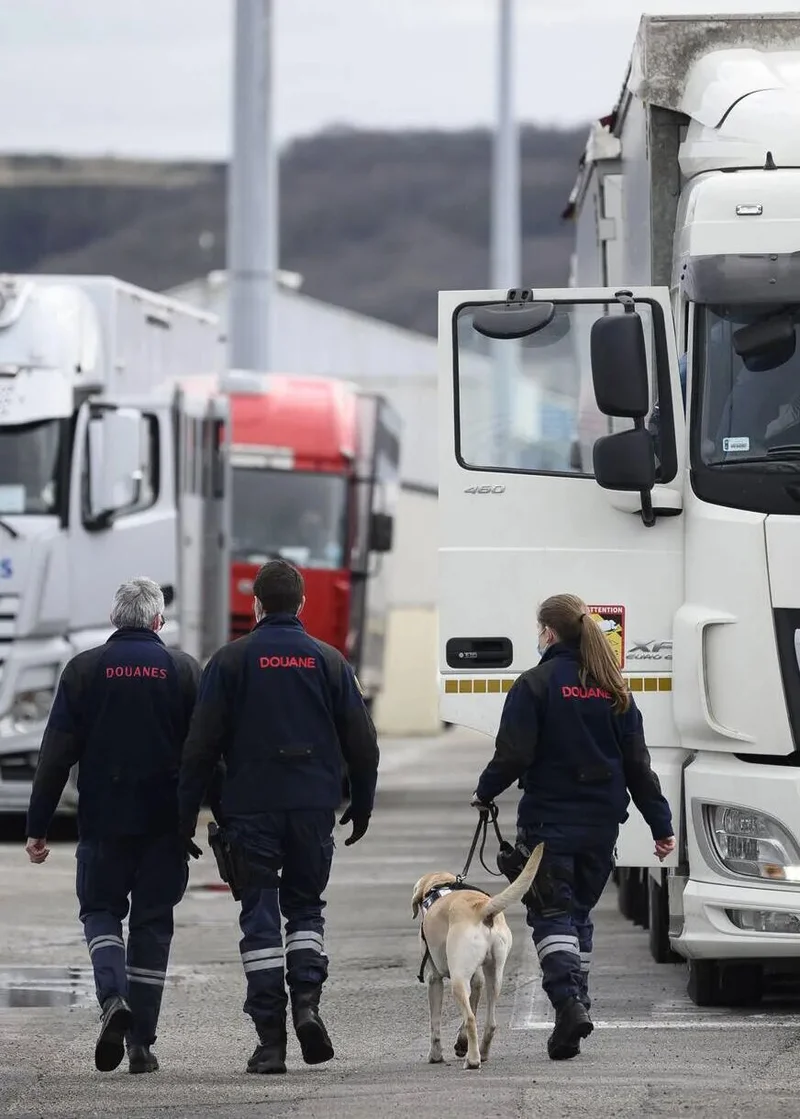 法国某港口,海关人员检查即将装船的货车