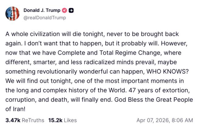 顾问们表示,川普真正想要的是吓唬伊朗人并结束冲突。在他的最后期限到期前不到90分钟,川普宣布了一项脆弱的两周停火协议。