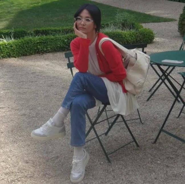 好巧不巧,宋慧乔还在社媒自曝了一系列近照,打扮格外放飞,红色开衫、白色内搭和细腿牛仔裤一上身,搭配上透明镜框圆眼镜,不止一位网友直呼宋慧乔好像我奶奶——她戴的真的不是老花镜吗?