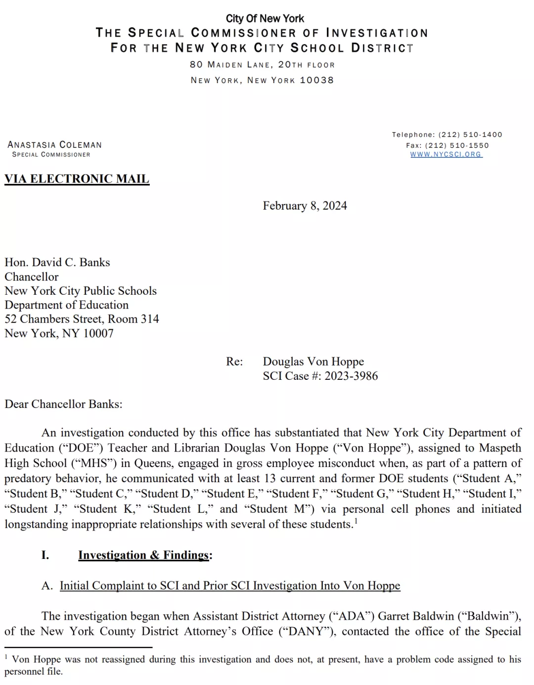 据纽约市特别调查专员办公室(SCI)1月份发布的报告,这名涉案人员是马斯佩斯高中(Maspeth High School) 的图书管理员——道格拉斯·冯·霍普(Douglas Von Hoppe)。