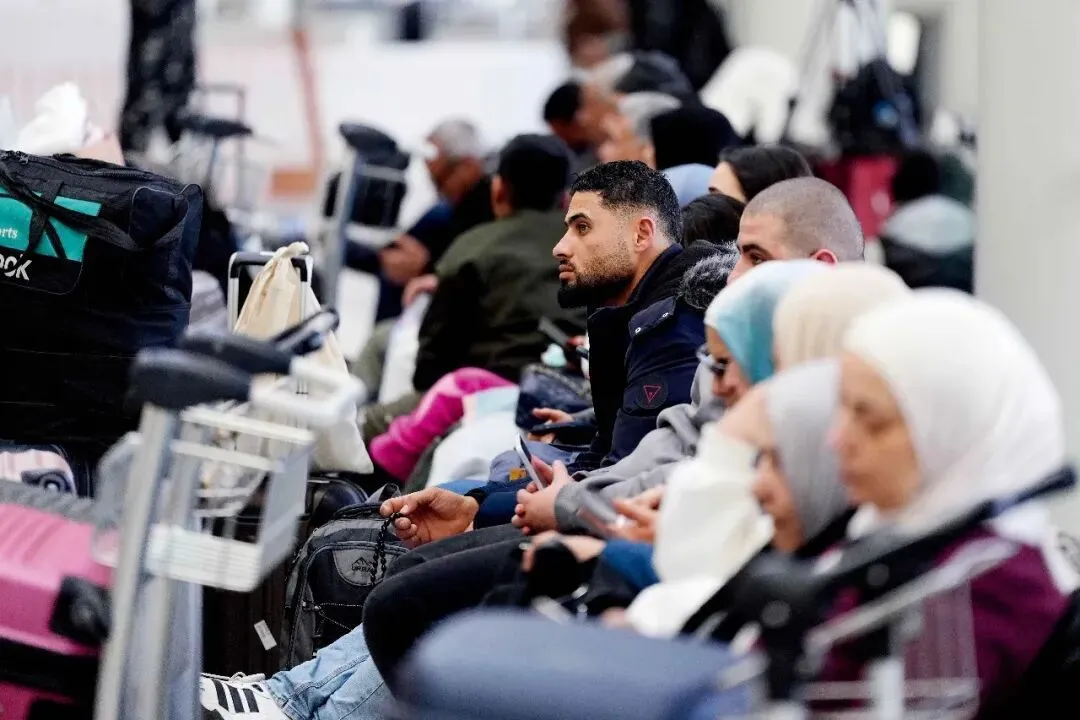2月28日,黎巴嫩貝魯特,許多航班被取消的旅客在機場出發大廳等待。圖/視覺中國