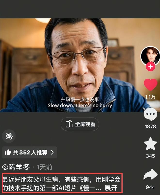 今年 4 月 22 日,陈学冬在社交平台更新了一条视频,带来了他亲手制作的 AI 短片《慢一点》。