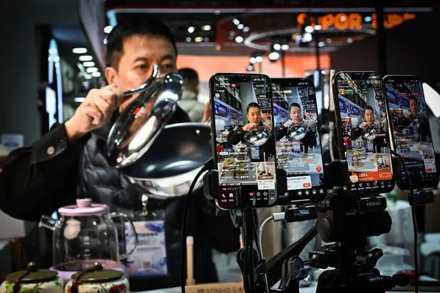 圖像來源,GETTY IMAGES圖像加注文字,2026年3月12日,在中國上海新國際博覽中心(SNIEC)舉辦的2026年中國家電及消費電子博覽會(AWE2026)期間,壹名男子在多支正進行直播錄制的手機前進行直播帶貨。
