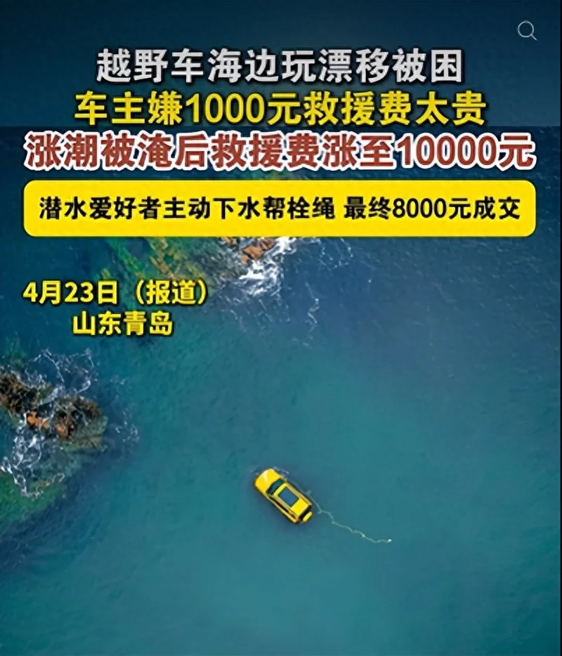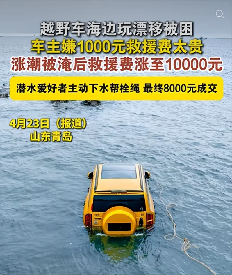 據媒體報道,近日,山東青島壹輛越野車在海邊玩漂移被困。車主起初嫌1000元救援費過高,協商無果。隨後潮水快速上漲淹沒整車,車主只得高價求助,救援方報價升至1萬元。