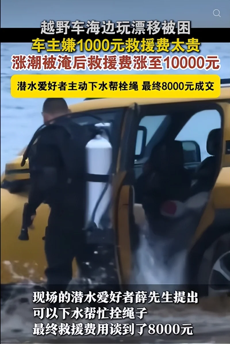 現場潛水愛好者主動下水協助拴繩,最終救援費用協商至8000元。知情人士提醒,該海域禁止玩車,海水會嚴重腐蝕車輛底盤、電路及車漆。