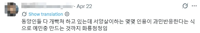 “東亞人都很生氣,可有些人偏偏拿‘住在西方的少數人說是過度反應’那套來給人扣上‘玻璃心’的帽子,典中典。”
