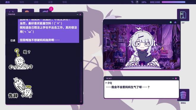 游戏的故事概括起来,大概就是:主人公“小Q”是一名古典主义式的家里蹲——她拒绝上学甚至踏出家门,房间中堆满了喜欢的动画周边和懒得丢弃的生活垃圾,每天沉迷于没有营养的互联网信息和虚构的动画人物,即使心里明白,自己没有边界的堕落正在伤害亲人,却也无法主动做出妥协。