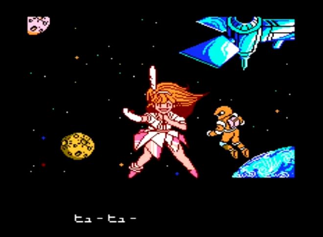这款游戏是由Natsume株式会社开发的《偶像八犬传》,这家公司最有名的游戏IP,大概就是“徽章战士”和“奇奇怪界”了。而这首最古的“电波曲”,就是游戏女主角西园寺绘里香,在作为偶像时的代表曲目《你是HOEHOE女孩》(君はホエホエ娘)。当然,凭借FC时代的存储技术,当然不太可能真将一首歌曲收录在卡带中。在这时,美少女游戏市场上唯一能将角色声音直接传达给玩家的,还是1987年发售的,搭配了声音合成装置JASTSOUND的“天使们的午后”。