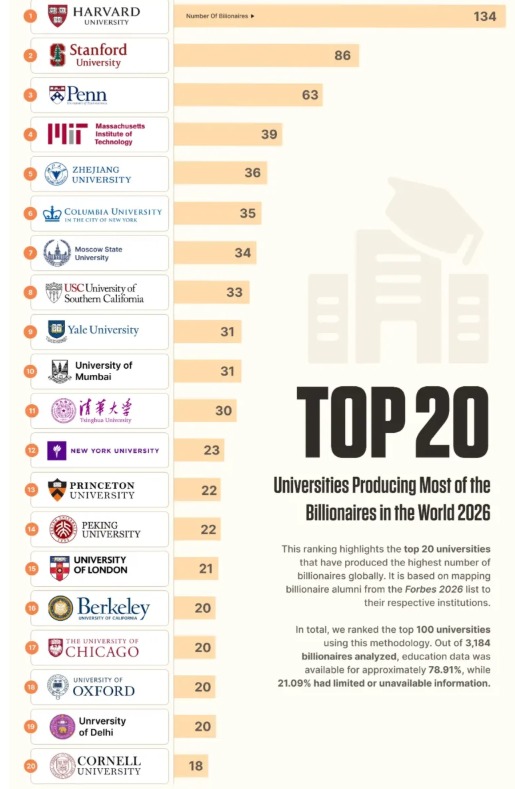 哈佛大學以134位億萬富豪校友位居榜首,總財富高達1.235萬億元;斯坦福大學以86位富豪、1.208萬億元緊隨其後;賓夕法尼亞大學則以63位富豪、1.093萬億元排名第叁。這叁所高校也是全球僅有的校友總財富超過1萬億元的大學。