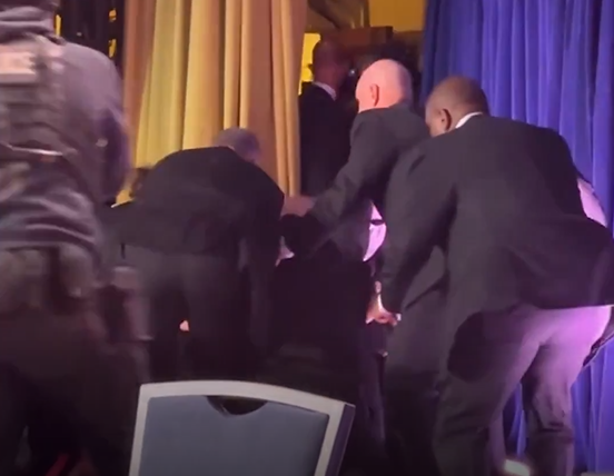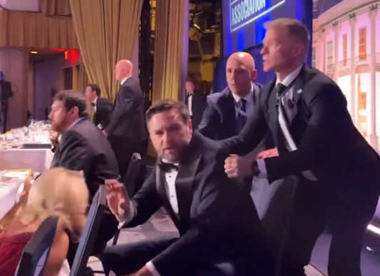 晚宴现场传出枪响后,副总统范斯(中)被维安人员半扯半拉请离场。 (撷取自X平台@MSNOWNews)
