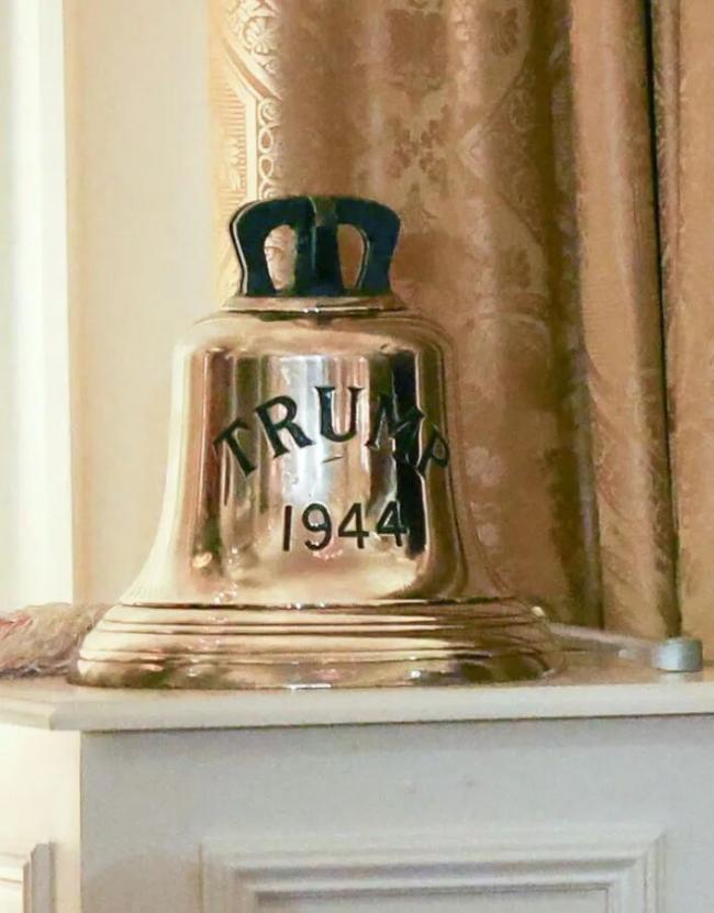 如圖所示,這口鍾上面刻著“Trump”,因為它來自贰戰英國皇家海軍潛艇,而這艘潛艇的名字叫HMS Trump,1944年下水,在太平洋戰場執行過任務。