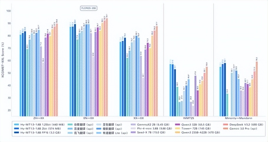 值得注意到是,仅以 1.8B 参数量,Hy-mt1.5 实现了比肩商业翻译 API 和 235B 级大模型的翻译效果 。在严格的评测基准中,其翻译质量不仅超越了 Google 翻译等主流系统,更证明了在高效优化下,轻量级模型能够展现出亮眼的翻译能力。