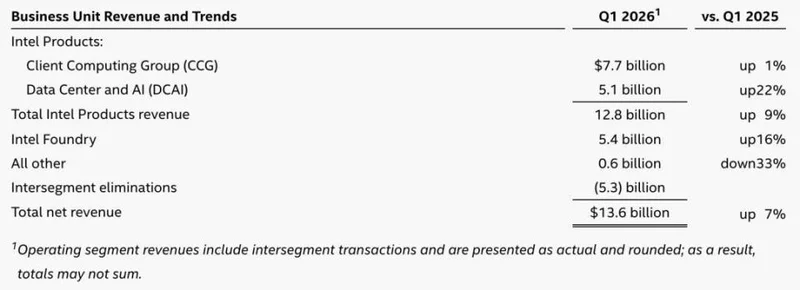 壹季度,英特爾實現營收 136 億美元,同比增長 7%,主要受益於數據中心及 AI 業務的增長。