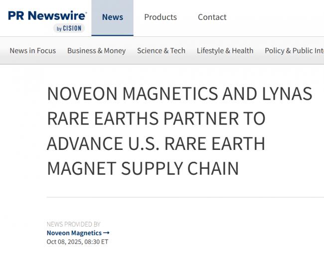 2025年8月,萊納斯與Noveon Magnetics簽署了具有約束力的加深合作的協議。Noveon Magnetics是美國唯壹的燒結稀土磁鐵生產商,萊納斯與這家美國公司協議合作建設壹個完全獨立於中國稀土供應鏈之外的完整“礦對磁鐵”供應鏈。