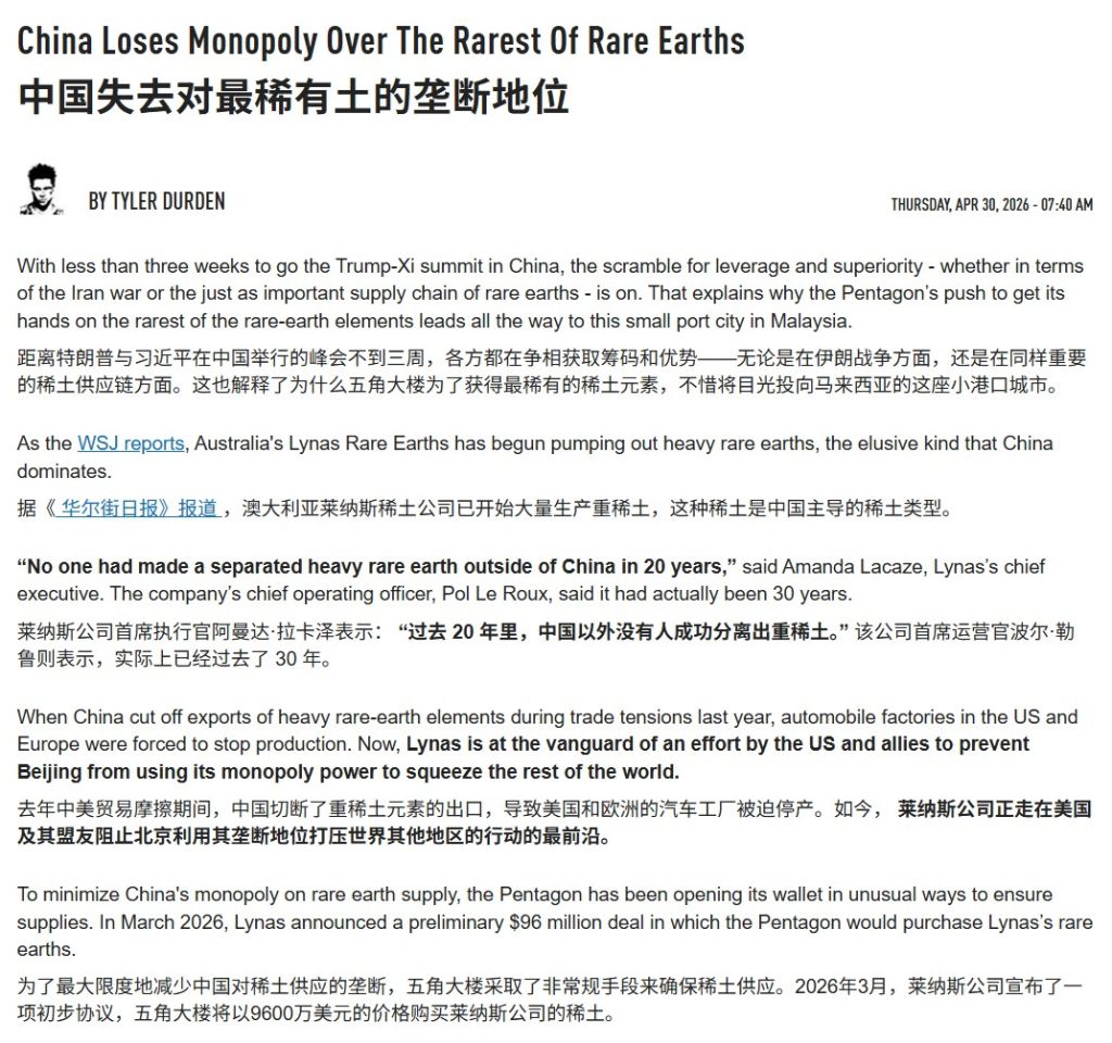 壹、澳大利亞稀土企業萊納斯,2026年第壹季度稀土氧化物產量同比飆漲67.5%。
