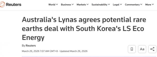 3月26日,萊納斯與韓國LS Eco Energy簽署的《框架協議》,旨在越南建設壹座稀土金屬加工設施,用於生產釹鐠、釤、鏑和鋱金屬。目前萊納斯正在越南勘察潛在投資地點。LS Eco Energy首席執行官李相浩告訴路透社,計劃在2026年第肆季度開始越南工廠的運營。