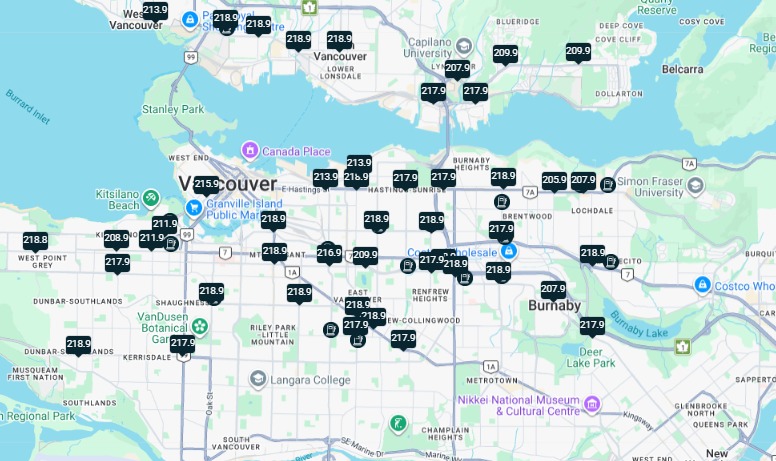 油價監測網站gasbuddy顯示今天周肆上午大溫地區的油價如下: