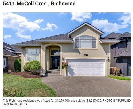 位於列治文McColl Crescent的壹套肆臥住宅以128.7萬加元成交,掛牌價約129.99萬加元。
