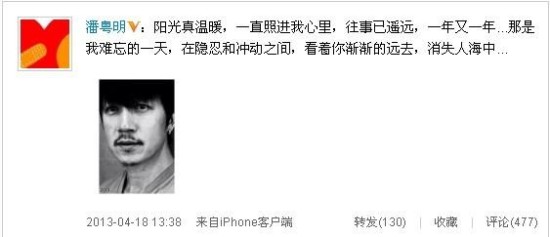 導語:4月18日下午,潘粵明微博發了壹段莫 名的感傷文字,“陽光真溫暖,壹直照進我心裡,往事已遙遠,壹年又壹年……那是我難忘的壹天,在隱忍和沖動之間,看著你漸漸的遠去,消失人海中。”細心網 友發現,明日也就是4月19日正是董潔的生日,懷疑潘粵明正是在當日發現了妻子出軌的端倪,因此生發出許多感觸。
