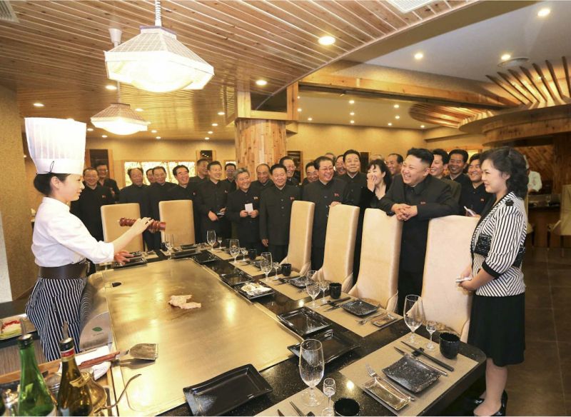當地時間4月28日,朝鮮電視台公布,金正恩與夫人李雪主視察即將開業的鐵板燒店的照片。