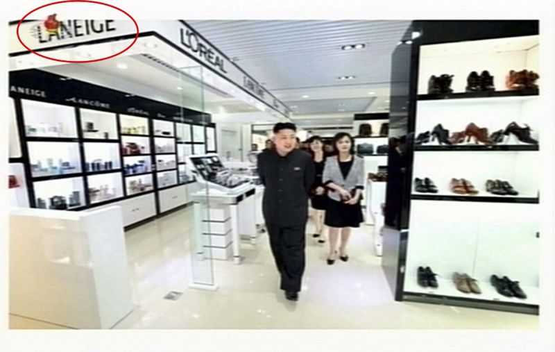 當地時間4月28日,朝鮮媒體公布,金正恩和夫人李雪主壹起參觀便民設施。蘭芝化妝品拾分顯眼。