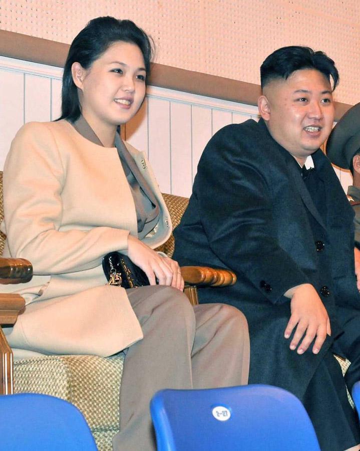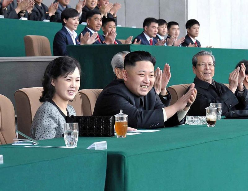 2013年4月29日,朝鮮最高領導人金正恩與夫人李雪主在金日成體育場觀看萬景台獎運動會甲級男子足球賽。