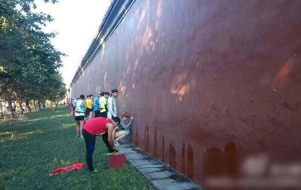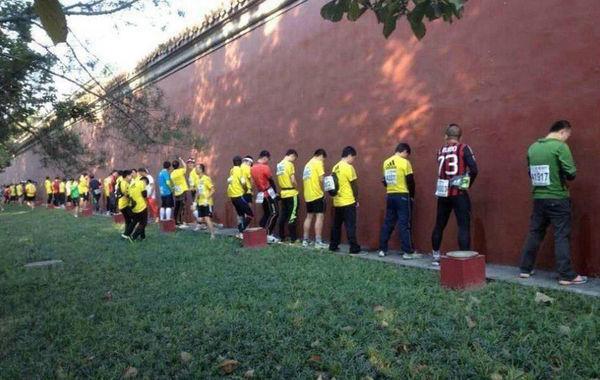 前天比赛开始后,一组选手就地如厕的照片便在网上疯传。照片里,选手排成一排,对着路边绿化带以及天安门广场边的红墙如厕,被网友戏称为“尿红墙”。