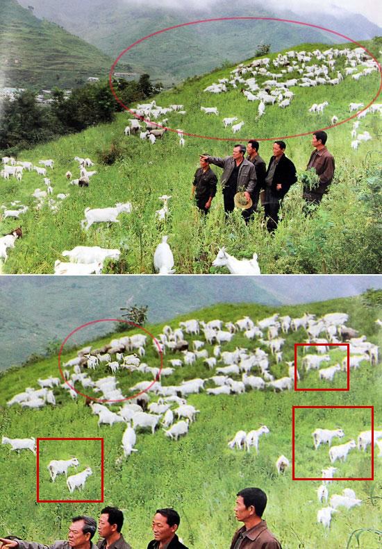 這張“造福的羊基地”刊發於《朝鮮畫報》2010年12月壹期。歌頌的是位於平壤市江束郡的救貧畜產專業合作農常這個“山羊農潮也同樣出現了為使山羊數量看起來很多的造假照片。