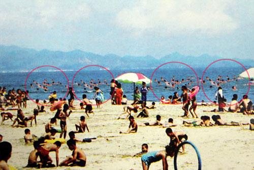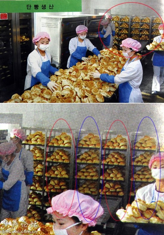 這張“甜面包生產”是《朝鮮畫報》2010年5月第伍期中的照片。其中也出現了造假的痕跡。在糕點店職員們制作面包的場景後面的架子上裝滿了面包。但是如果把這張照片放大來看,會發現堆起來的面包存在彼此樣子相同的部分。這也是使用“圖章”功能合成的。