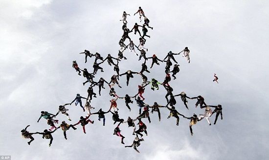 当地时间11月30日,她们当中的63人终于挑战极限成功。这63名跳伞者分别乘坐3架飞机,从5000多米的高空手拉着手以倒立的姿势跳下,并组成“雪花”队形,打破了此前41名女性用该姿势集体跳伞的纪录。