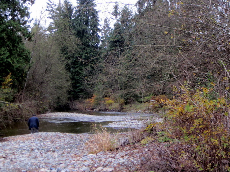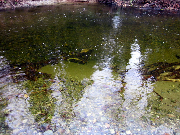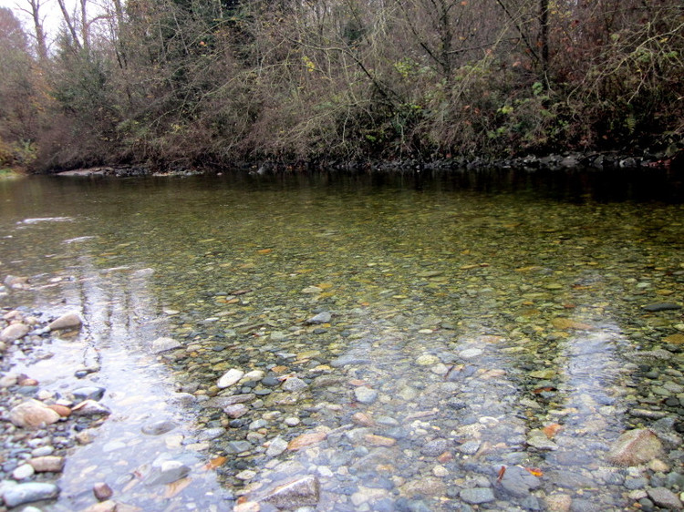 河水清澈见底,河底深浅不同,水深处就像是她家的大鱼缸、养鱼池,很多游累了正在养精蓄锐准备再向上游冲刺的鱼,黑压压一片沉在水底。这里可以算得上是一个观赏三文鱼回流的微型景点了。