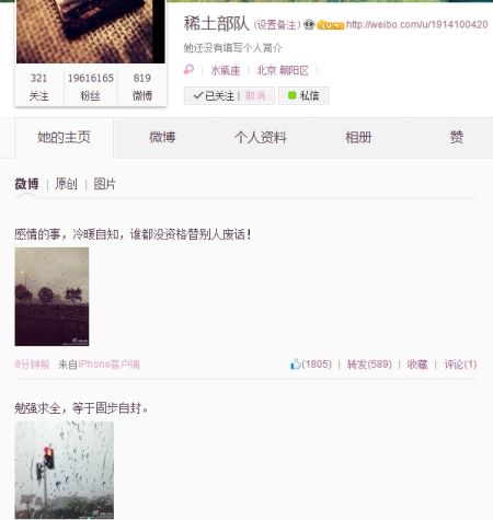 终于,章子怡有些按耐不住,在周一上午连发两条微博感慨道:“勉强求全,等于固步自封”,并且配了一张雨水覆盖汽车玻璃的图片,透过玻璃模糊地看着红灯的情景。 20分钟之后,章子怡又发了一条微博,感叹感情是人家自己的事,让其他无关的人都别废话:“感情的事,冷暖自知,谁都没资格替别人废话!”依旧是配了一张雨天图,模糊地透过汽车玻璃看着外面的树木、路灯的情景。
