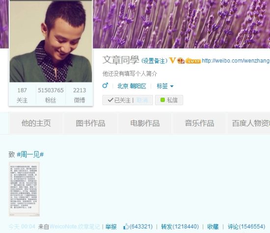 文章声明12小时转评近240万 破王菲纪录 文章出轨恋姚笛一事引起的全民八卦狂欢,究竟威力有多大?3月31日的凌晨,文章终于让这场“周一见”的八卦潮有了回响,文章通过新浪微博发表声明自认有错、咎由自取。