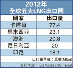 據國際天然氣聯盟(International Gas Union)的全球LNG年度報告顯示,於2012年底卡塔爾出口伷潾球32.6%居第壹,出口量高達7740萬噸(見附表)。此外,澳洲現已有8個建成或興建中LNG出口項目,另10個正在計劃興建(見圖)。