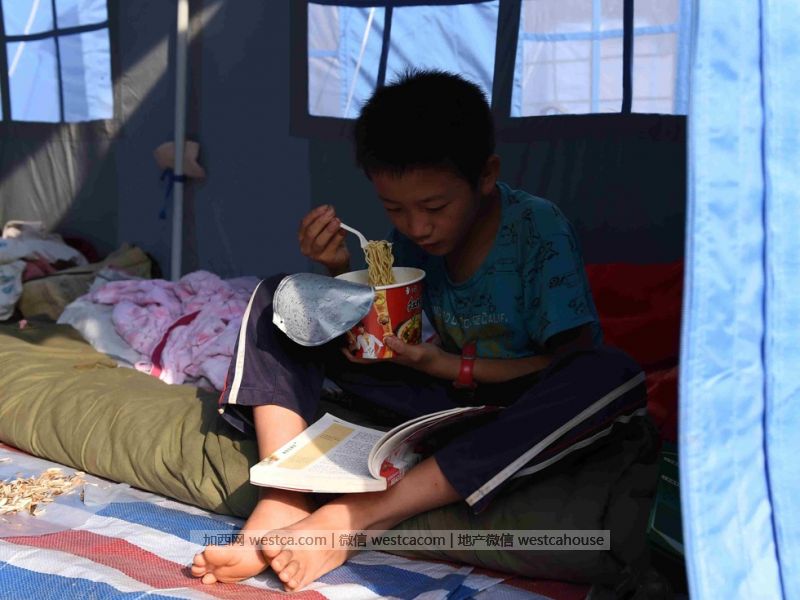 12歲的張興圭在雲南魯甸縣龍頭山鎮的臨時安置點內壹邊吃方便面壹邊看書。