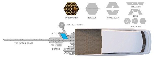 這艘船目前還只是壹個概念。這張設計圖顯示,它可能配有摩托艇專用的泊位和壹個連接到六角形“就餐島”的泳池。就餐島將為客人打造壹個驚人的用餐場所。