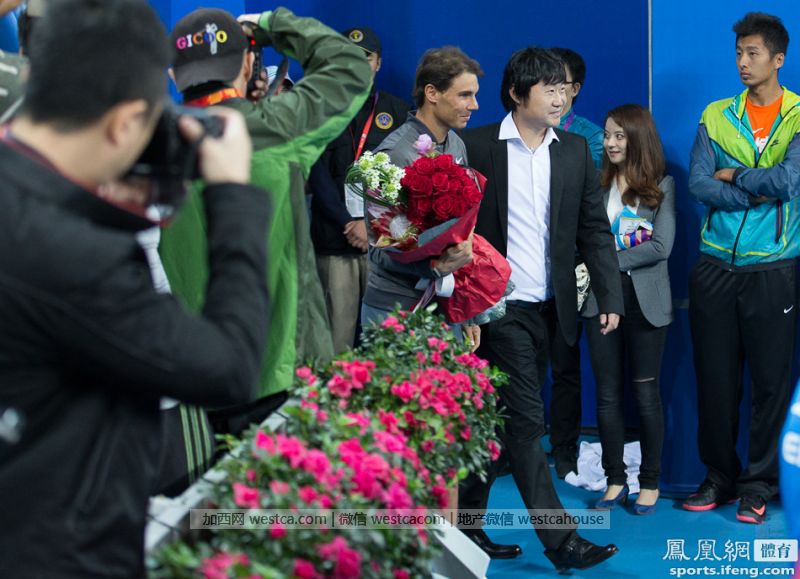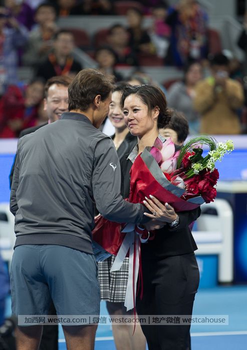 告别仪式最后环节,李娜的丈夫姜山和ATP巨星纳达尔作为神秘嘉宾出场为李娜道别,纳达尔更是为李娜亲自送上鲜花。