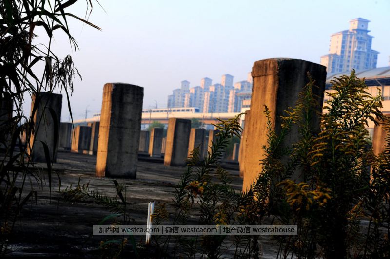 10月26日,上海市,位于地铁9号线松江大学城站东侧的一片千根水泥桩林立的“丛林”,只见一枝黄花、芦苇等杂草丛生,前几年施工后留下的工棚破败不堪。