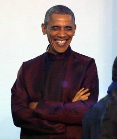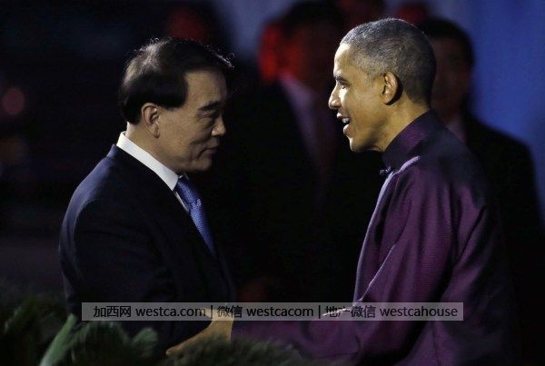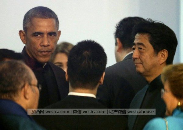 2014年11月10日,北京,各國領導人抵達出席國家游泳中心“水立方”舉行的APEC領導人歡迎宴會。APEC領導人所傳服裝是壹系列展示中國人新形象的中式服裝,其根為中,魂為禮,形為新,謂之“新中裝”。用“海水江崖紋”的設計,賦予21個經濟體山水相依,守望相護的寓意。