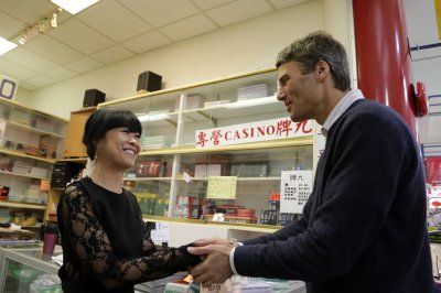 羅品信(右)在華埠向商家拜票。(記者張耀仁/攝影)