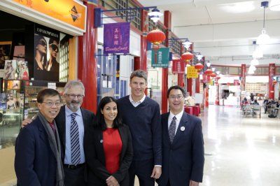 羅品信(右贰)與偉景候選人團隊在華埠拜票。(記者張耀仁/攝影)