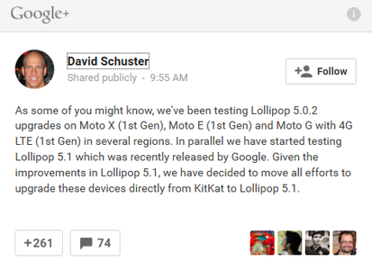 今天摩托罗拉软件产品经理大卫・舒斯特尔(David Schuster)在其Google+页面宣布,该公司打算跳过Android 5.0.2,直接为第一代Moto设备提供Android 5.1升级。