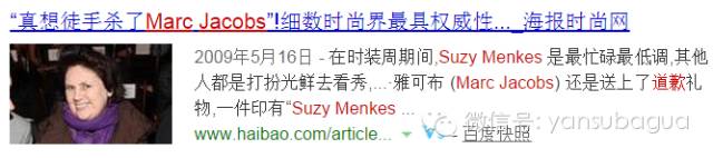 2008年紐約時裝周上Marc Jacobs的秀整整推遲了兩個小時,Suzy Menkes隨即寫了篇尖酸刻薄文章說“真想殺了Marc Jacobs,有生之年再也不想看Marc Jacobs的秀了。”