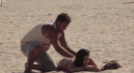後來,美女翻身正面朝上,男子開始在美女肚子上塗抹,突然,他嚇得把手縮了回去,原來,他發現美女的胯部有明顯的腫脹凸起。他朝美女喊了幾句,手還朝她的胯部比劃著,然後憤然離去。