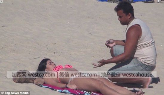 塗之前,男子還貼心地把防曬霜在手中預熱了壹下...看來是老手了....然後,優哉游哉地在美女的背上塗了起來,表情也是相當享受。