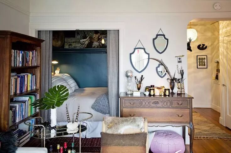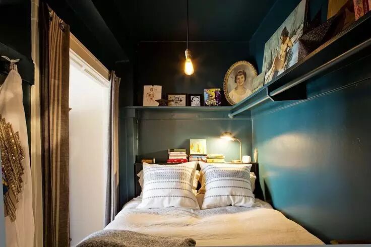 在房間壹角用簾子隔出壹個小“臥室”,只放得下壹張床。既然只是壹個睡眠區,那就用暗色包裹,創造壹個最適合睡眠的環境。