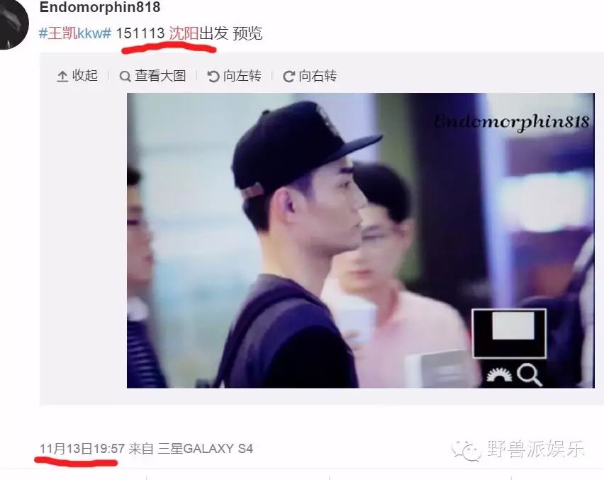 11月13日王凱從沈陽飛往上海,同樣有粉絲在沈陽機場看到王凱,所以11月12日王凱只能是在沈陽
