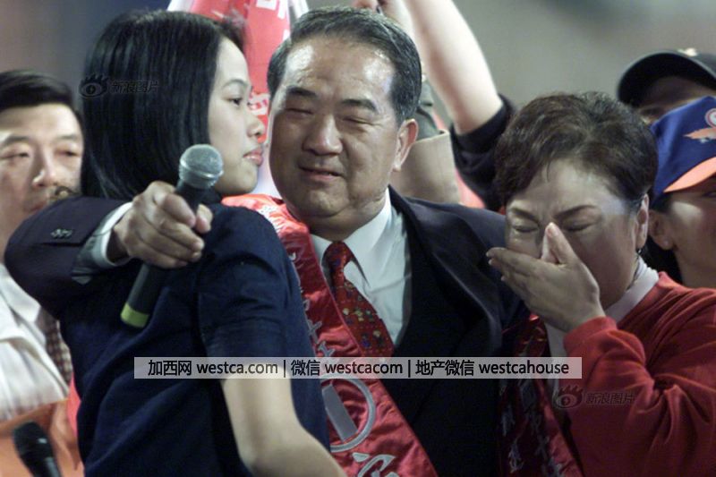 2000年大选,国民党高层出现分化,本来李登辉意图让连宋搭档,但不料宋楚瑜退出国民党,以独立参选人身份竞选,削弱了国民党实力,结果宋楚瑜落选,国民党候选人为连战也败给民进党的陈水扁。图为2000年,宋楚瑜和妻女在大选前的最后一个竞选集会上。