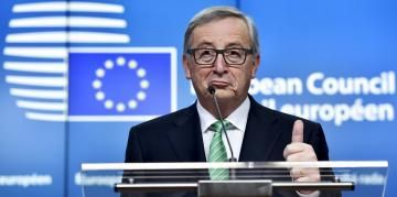 欧盟委员会主席容克在欧盟峰会记者招待会上,2016年2月19日