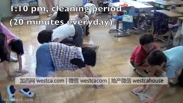 在午餐后,每天都会花20分钟,用手拿抹布擦地板、清洁环境!